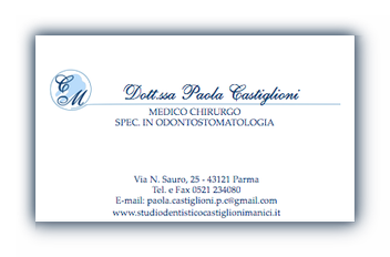 Dott.ssa Paola Castiglioni Laurea in Medicina e Chirurgia Specializzazione in Odontostomatologia presso l'Università di Parma